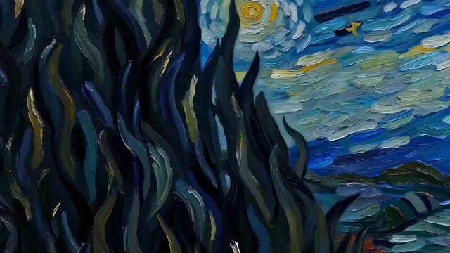 【风格】梵高后印象派油画,厚涂肌理,标志性的旋转笔触,梦幻感,高饱和度的蓝黄对比。【时长】15 秒动画【视觉内容】这是一个完全由厚重油彩构成的动态世界。天空:深蓝色的夜空中,巨大的黄色星星和一弯新月被放射状的短笔触环绕,星云像奔腾的河流般狂野地旋转(旋转运动)。前景:左侧是一棵巨大的柏树,扭曲盘旋,如黑色火焰般直冲云霄。背景:山谷中沉睡的小镇,房屋窗户透出温暖的黄色光芒,同样以旋转笔触描绘。整个场景随着笔触的方向缓慢流动和呼吸。
