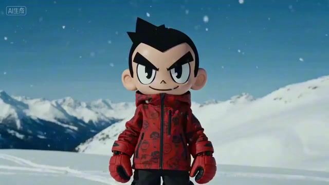 请根据提供的参考图片生成一段滑雪视频。整体风格应明亮、清新,充满运动活力,画面流畅,镜头语言富有电影感。时间线和镜头设计如下: 0–3 秒:图中人物在雪中微笑看向镜头。镜头轻微晃动,雪花飘落。背景风声逐渐增强,画面呈现出疾风飞雪的快速流动感。 3–5 秒:快速切换至人物脚部的特写,表现雪板固定器锁死的瞬间,以及雪被踩碎的细节。同时,镜头上摇,连接到一个陡峭雪坡的俯瞰镜头,坡度清晰,暗示即将爆发的速度。 5–8 秒:图中人物从高处高速滑下。镜头一为侧前方中景跟拍,身体前倾,动作凌厉;镜头二切换至俯瞰视角,陡峭的雪坡向下延伸,雪道线条快速拉伸,营造出强烈的速度感。 8–11 秒:连续快速剪辑。低角度贴地镜头,雪板擦过雪面,高速扬起雪粉;远景镜头展现人物在陡坡上做出优美转弯,与雪线形成流畅的弧度。 11–13 秒:镜头回到正前方跟拍。人物高速冲向镜头,近距离急转弯,扬起大量雪花。 13–15 秒:大量雪粉直接溅到镜头上。画面被白色雪雾覆盖,镜头短暂失焦后定格,留下强烈的动态余味。整体强调速度感、剪辑节奏、真实的运动感和青春活力。画面明亮,不沉重,突出滑雪的刺激与自由。