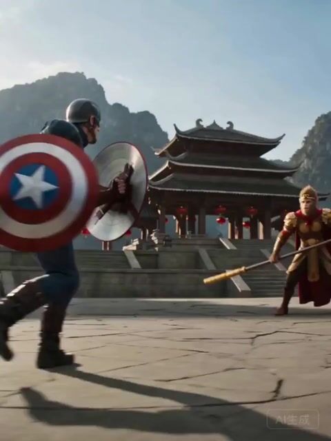 动态动作镜头。美国队长向前冲锋,掷出他的振金盾牌。天命之人跃入空中,将如意金箍棒变为一根巨大的柱子,并向下挥舞。盾牌和金箍棒在半空中相撞,产生一股冲击波,震碎了他们脚下的石砖。慢动作,火花和碎片四处飞溅。镜头在两位战士之间交替特写。天命之人启动他的七十二变,分裂成三个克隆体,包围了美国队长。美队咧嘴一笑,举起盾牌,同时冲向所有三个克隆体。金色能量和蓝色振金光芒发生巨大爆炸。镜头拉远,从空中史诗般地俯瞰被光芒吞噬的战场。